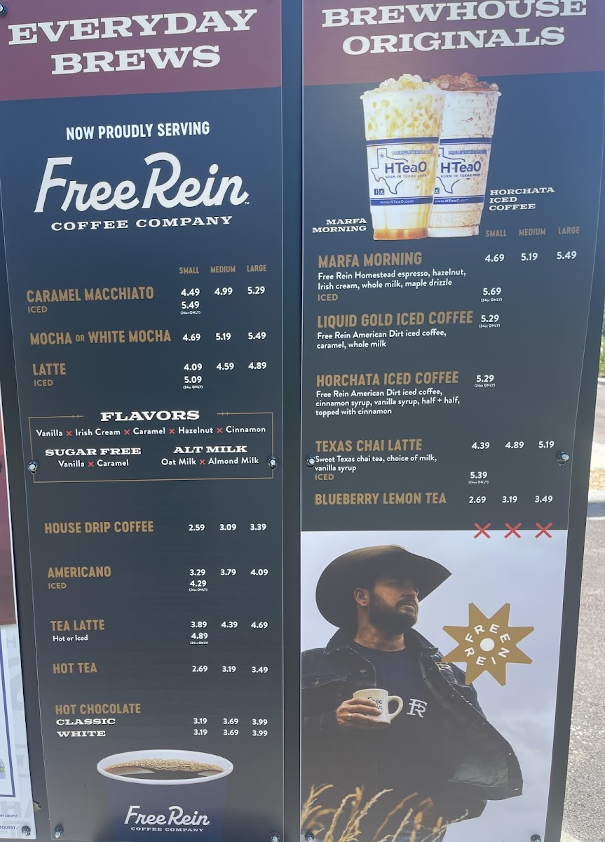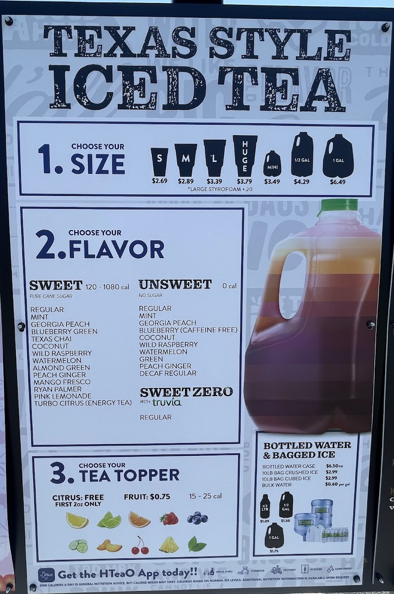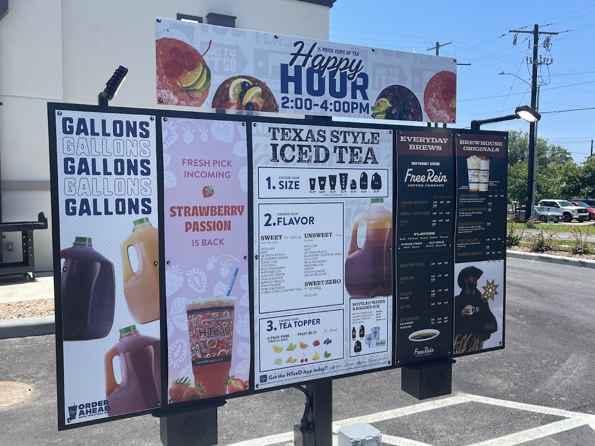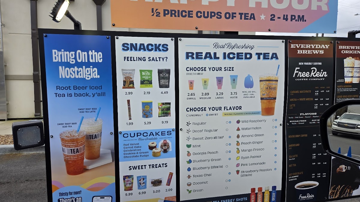 The menu at Hteao - Lafayette offers a delightful range of beverages and snacks, ideal for anyone craving refreshing drinks or a quick bite. Their Limited Time Only items are a must-try, featuring the Double Berry Refresher, Hot Honey Refresher, and the indulgent Sweet Spiced Orange Pistachio Latte (available hot or iced). For iced tea lovers, the Sweet Spiced Orange, Sweet Georgia Peach, and Sweet Blueberry Green teas are flavorful options, alongside an array of unsweetened varieties like the Unsweet Decaf Blueberry and Unsweet Green Tea. The Thirst Quenchers include vibrant drinks like the Razzler Refresher and Lemon Lav Refresher. Those seeking a fun twist can explore the Secret Menu, with unique items like Apple Pie, Berry Blast, and Coconut Sunset. For a coffee fix, there’s a selection of Iced Coffee options, such as the Pistachio Latte and Iced Caramel Macchiato, as well as Hot Coffee choices like the Texas Chai Tea Latte. If you're looking for a snack, indulge in Just Desserts Cupcakes or grab a protein-packed Clif Bar or Righteous Felon Beef Jerky. Don’t forget the quirky HTeaO Lip Balms, available in flavors like Blueberry Tea and Texas Chai Tea. Additionally, the store offers refreshing Gallons of Iced Tea and HTeaO Home Brew Tea sachets for tea enthusiasts to enjoy at home. Overall, Hteao offers a wide variety of beverages and snacks, making it the perfect stop for a quick refreshment or a flavorful treat.